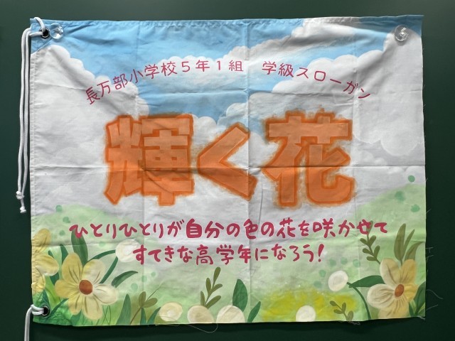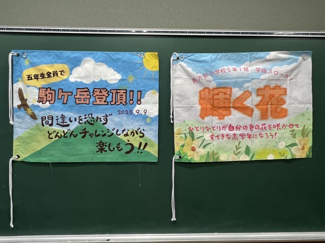 これまで休み時間などを使って制作してきた「登頂旗」が完成し、教室の黒板に飾っていました。