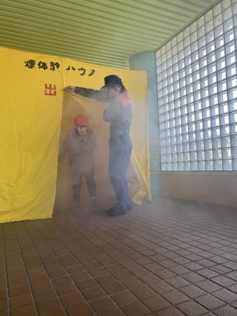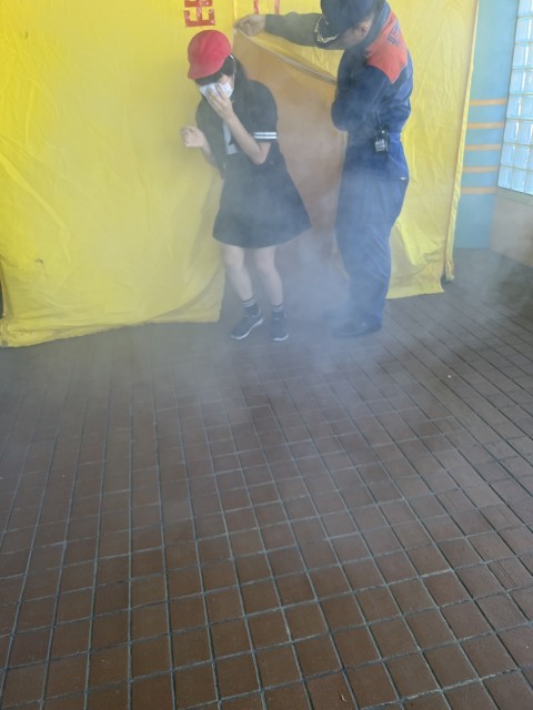 タオルやハンカチなどで口と鼻を覆う練習として、今回の避難訓練でも煙体験を実施しました。