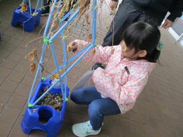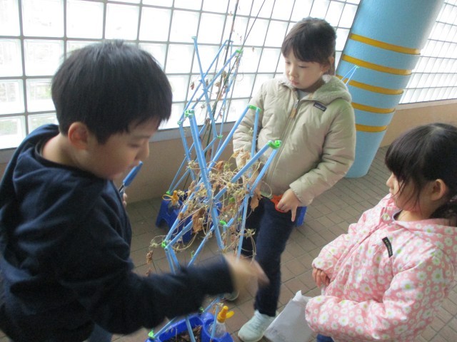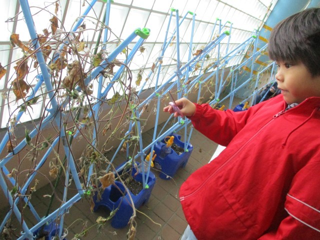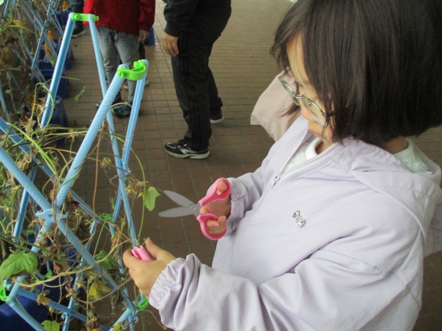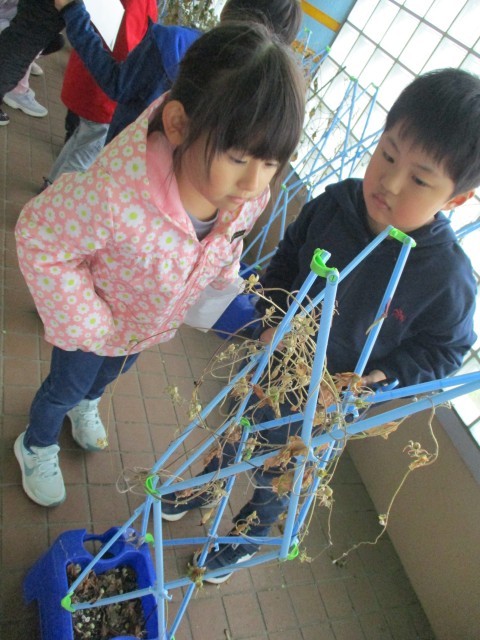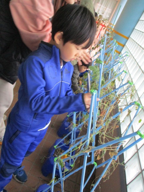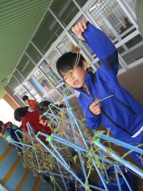 この日の1年生では、生活科で大切に育ててきたあさがおのたねをとりました。