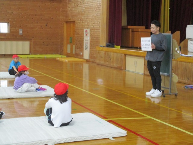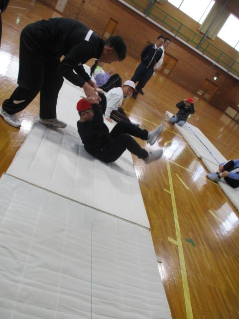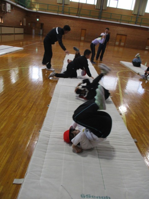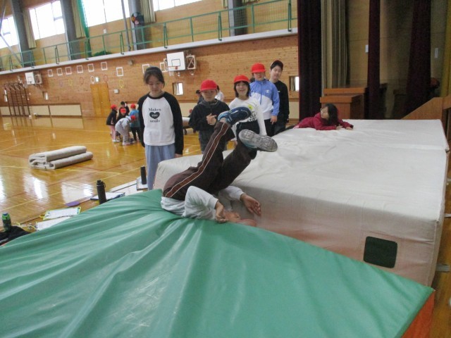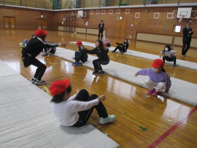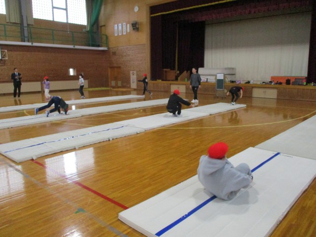 その後は、ゆりかごで段階的に手のつき方を学んだり、1・2年生のマット運動の例を活用した「慣らしの運動」をしたりしました。