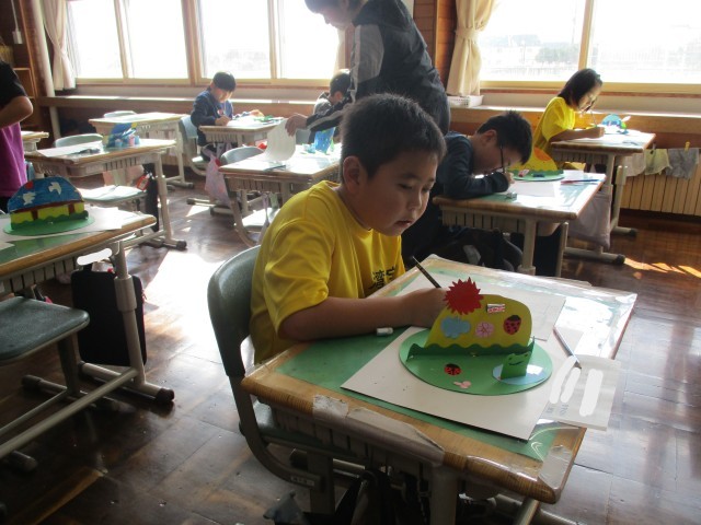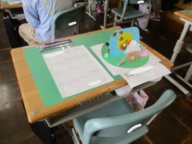 この日の3年生では、図画工作科で作った「うごいて楽しいわりピンワールド」の鑑賞会を行っていました。