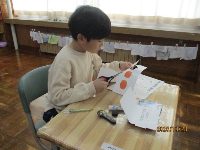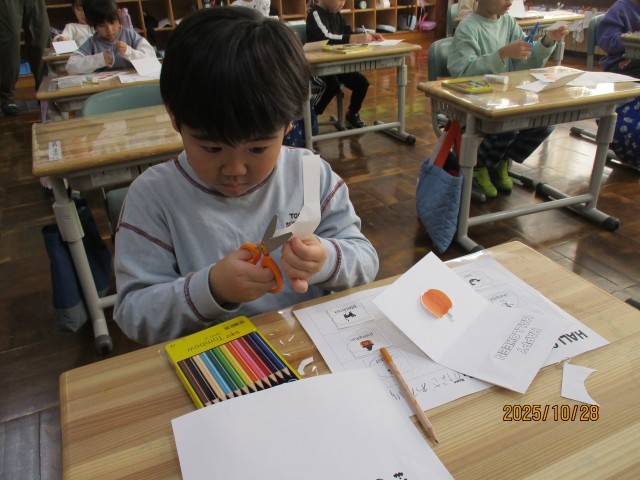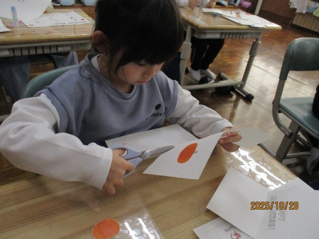 大きさの違うカボチャをきりとって、カードに貼っていきます。