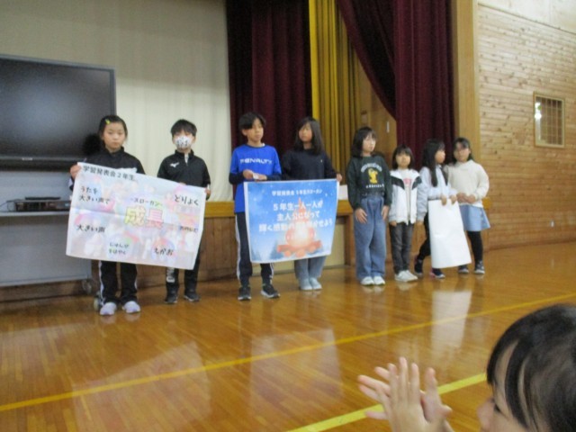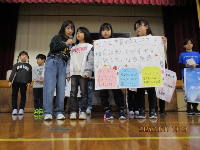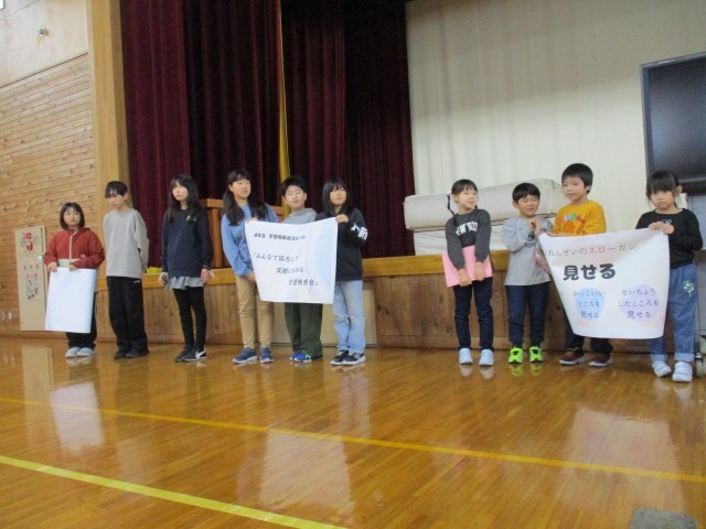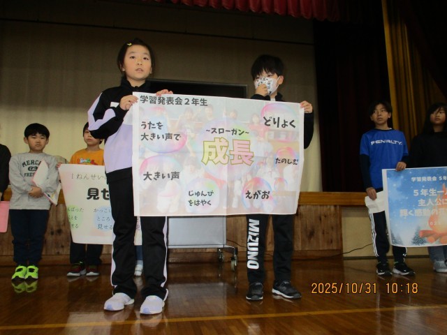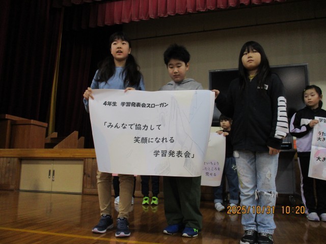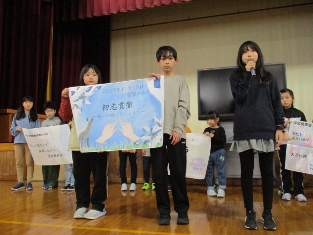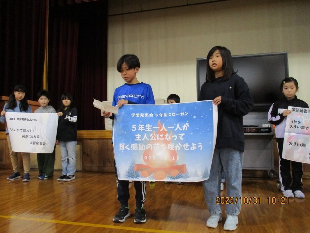 この日の全校朝会では、来月開催する学習発表会に向けた各学級のスローガンを発表しました。
