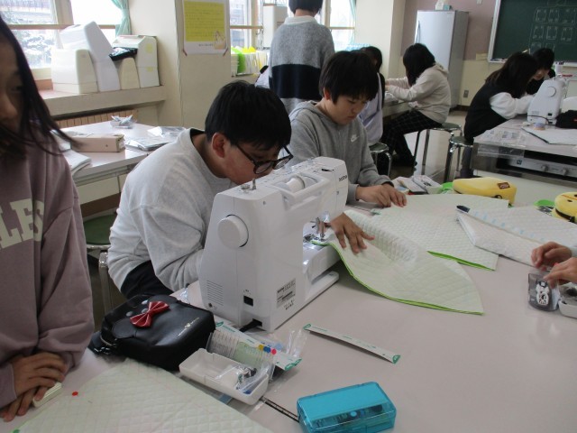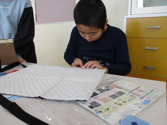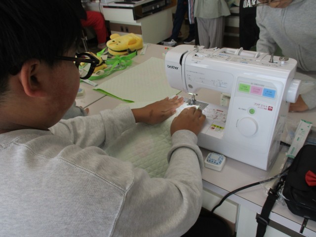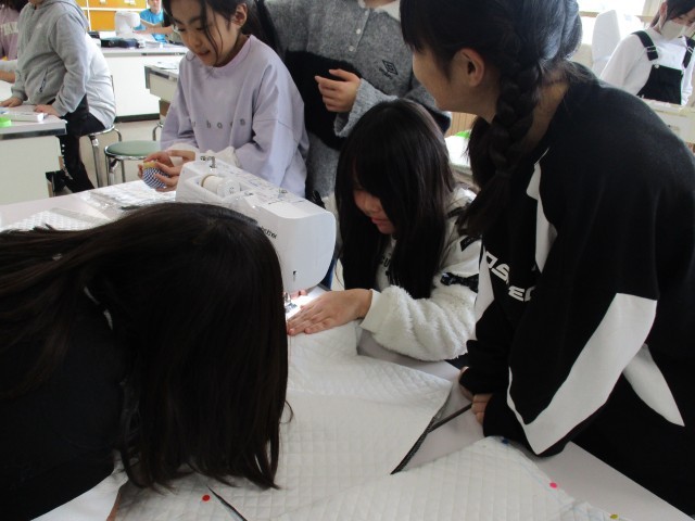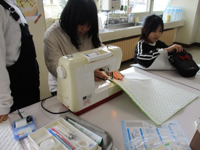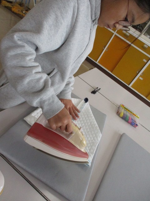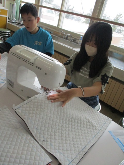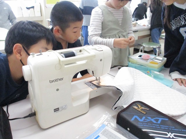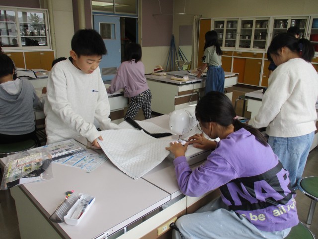 布にしるしをつけたり、わきをまちばりでとめたり、ミシンでぬったり、アイロンをかけたりと、丁寧に、そして手際よく進めていく5年生の皆さんの姿が素敵でした。