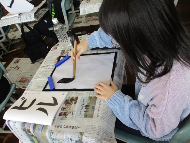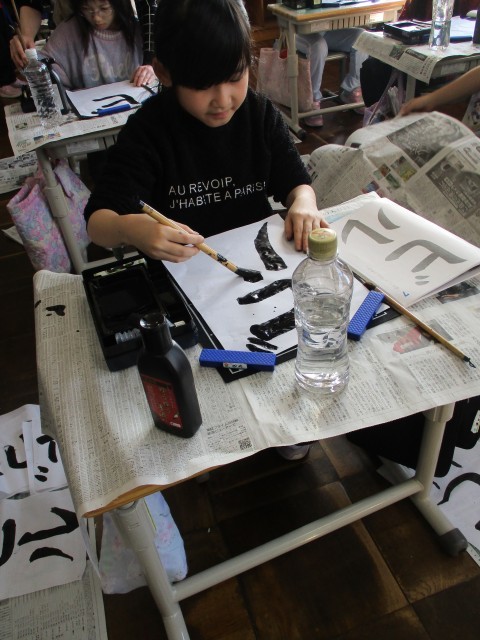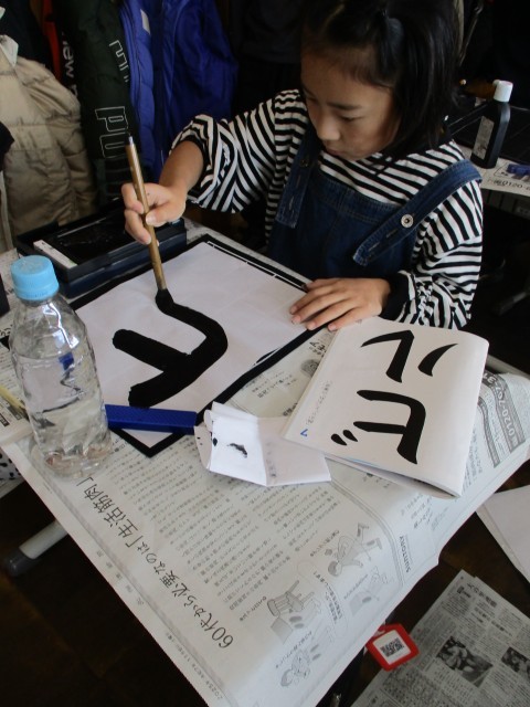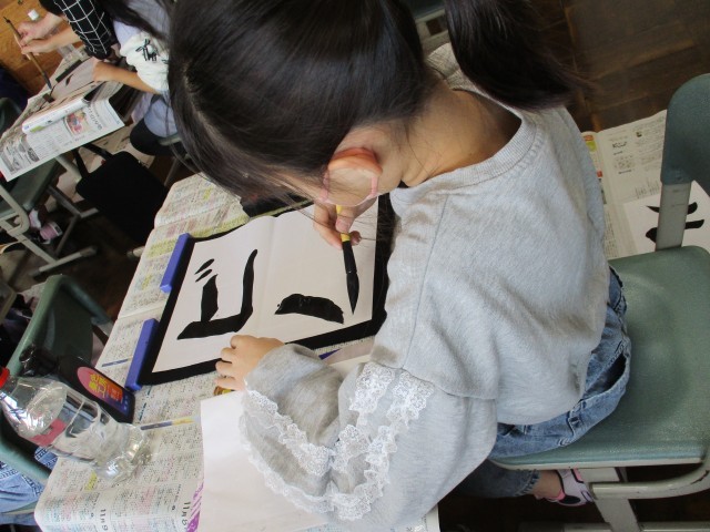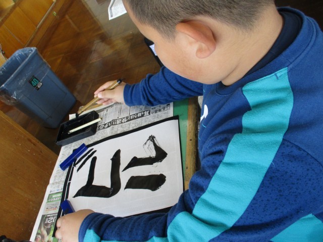 子どもたちは、「曲がり」と「おれ」の筆使いについて考えながら、筆を運んでいました。