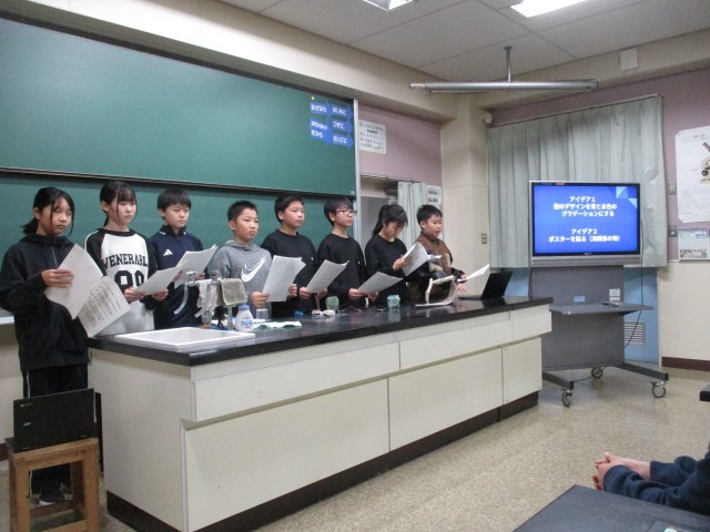 このチームは歴史に注目した発表。壁にアイヌ柄を入れて年表を展示したり、絵馬に願いを書いたり、みんなが親しめる本を置くなどのアイディアについて提案しました。詳細な仮駅舎内の配置図をはじめ、自分たちが大人になったときのことを想像して考察した内容を、相手を意識したスライドにまとめ、分かりやすく提案していました。