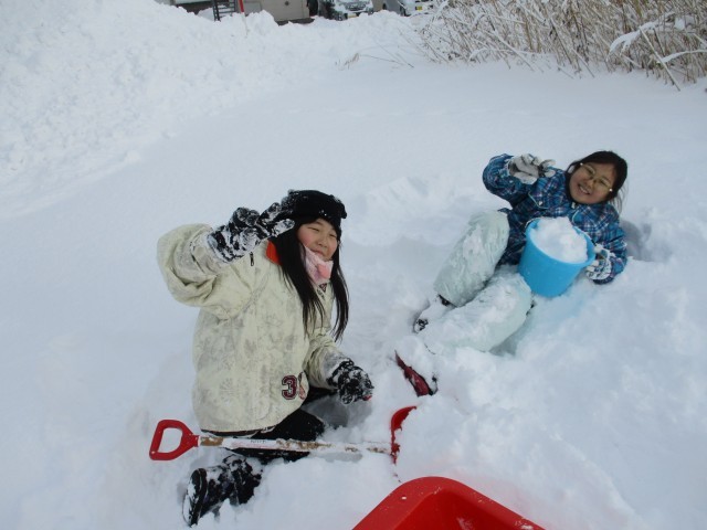 スキーと雪遊びの2チームに分かれて、スタートしました。
