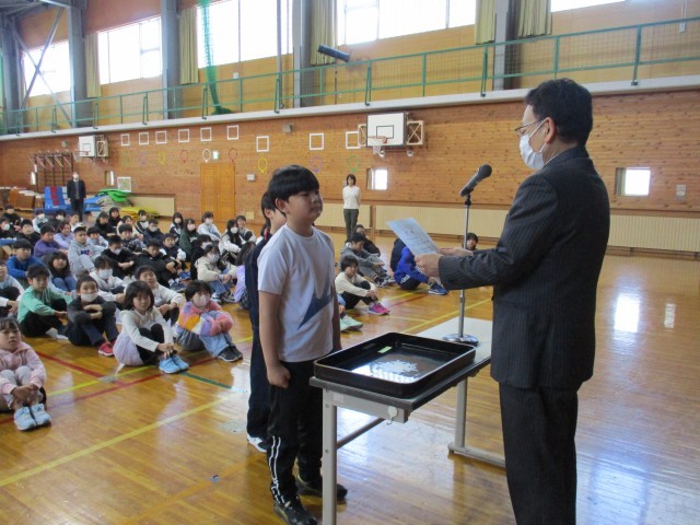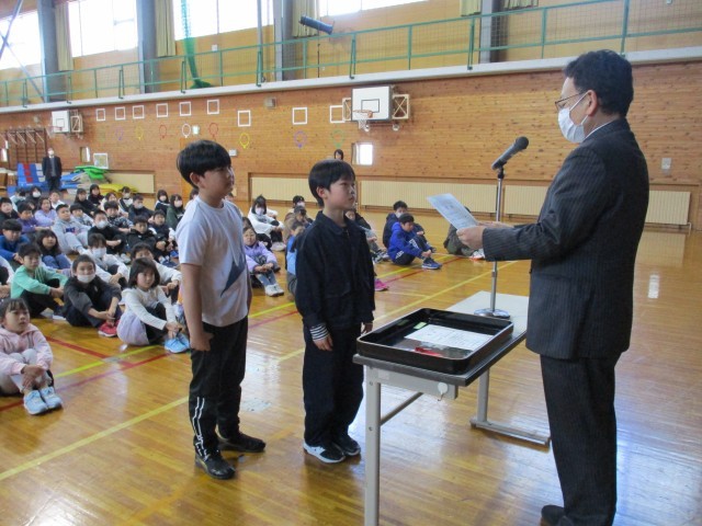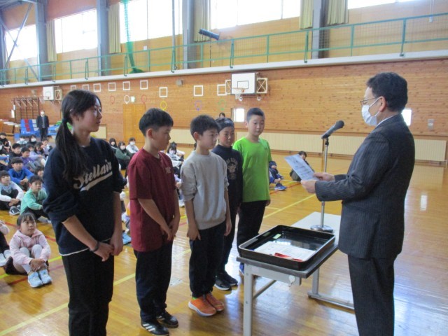 まず、本校の児童が所属している地域少年団(サッカー・団体、剣道・個人)の大会の表彰を行いました。