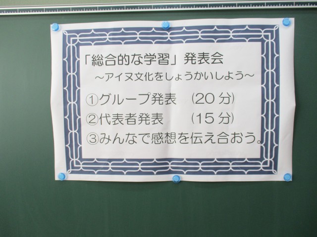 アイヌ文化について、食や衣服、住まい、歴史などの各視点をもとに、各グループで発表しあいました。