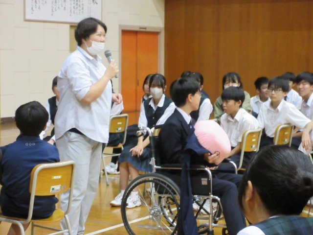 産後ケア助産院マーノの佐原和子助産師をお招きし、「性に関する指導」を行いました。生徒は、パーソナルスペースの実感や互いに相手を理解し、人格を尊重する大切さ、より適切な意志決定に基づく行動選択の重要性等について、理解を深めることができました。